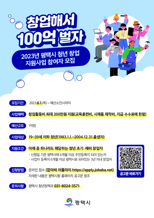 평택시(시장 정장선)는 창업 초기 경제적 여건 등으로 어려움을 겪고 있는 청년 초기·예비 창업자의 안정적인 사업 정착을 지원하기 위하여 오는 6월 1일부터 예산 소진할 때까지 신청·접수를 받을 것이라고 밝혔다.