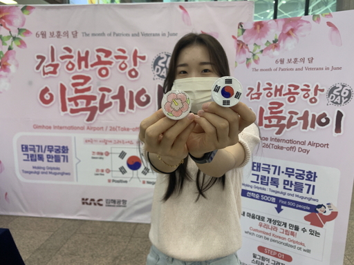 한국공항공사 김해공항은 6월 '호국 보훈의 달'과 '이륙데이(26DAY)'를 맞아 공항을 이용하는 여객이 참여할 수 있는 '나만의 태극기 그립톡 만들기' 체험 행사를 26일 국내선 및 국제선 터미널 2층에서 진행했다고 밝혔다.