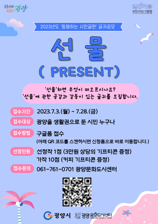 광양문화도시센터는 지난 5월 '만남'을 주제로 한 시민 글귀 모집에 이어 오는 28일까지 '선물'을 주제로 시민들의 다양한 메시지가 담긴 글귀를 공모한다.