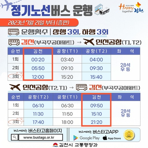 김천시(시장 김충섭)는 기존 왕복 2회 운행 중이던 김천 ~ 인천국제공항 버스가 오는 7월 21일부터 왕복 3회로 증편 운행한다고 전했다.