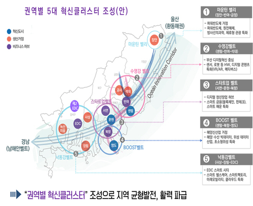 부산 전역에 새롭게 그려지고 있는 신산업 5대 혁신클러스터는 세계적 '그린스마트 도시'로 거듭나기 위한 친환경 기술개발과 디지털 전환 중심의 미래 핵심 신산업으로 이루어져 있다. 특히, 지역별로 뚜렷한 개성을 지닌 산업군을 더욱 고도화하고, 주변의 지리적 이점과 연계한 첨단산업을 집중 육성하고 집적화한 것이 큰 특징이다.