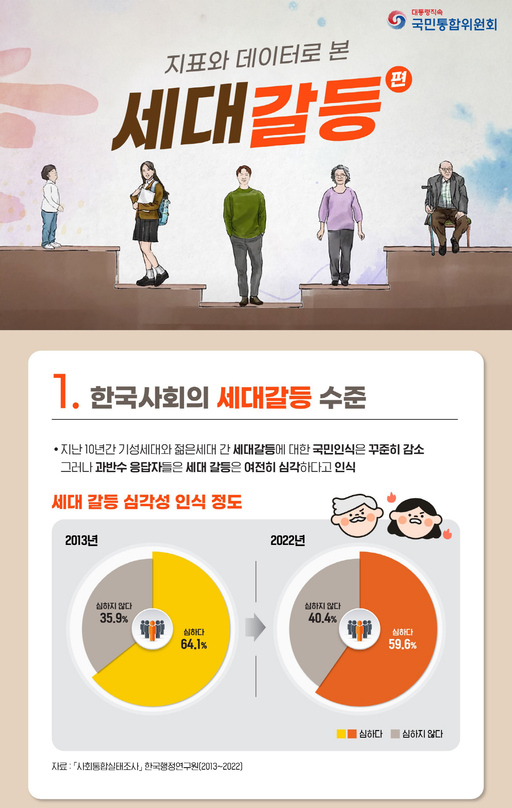 대통령 직속 국민통합위원회가 19일 '세대갈등'의 현 수준을 분석하고 세대갈등을 완화하는 정책 제안을 담은 이슈페이퍼 '지표와 데이터로 본 세대갈등'을 발간했다.