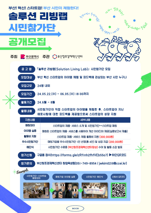부산시가 주최하고 부산창조경제혁신센터(이하 부산창경)가 주관하는 '2024년 스마트 시티 리빙랩 운영 활성화 사업'의 하나인 '솔루션 리빙랩(Solution Living Lab)'에 참가할 시민 참가단을 오는 6월 5일까지 모집한다고 밝혔다.
