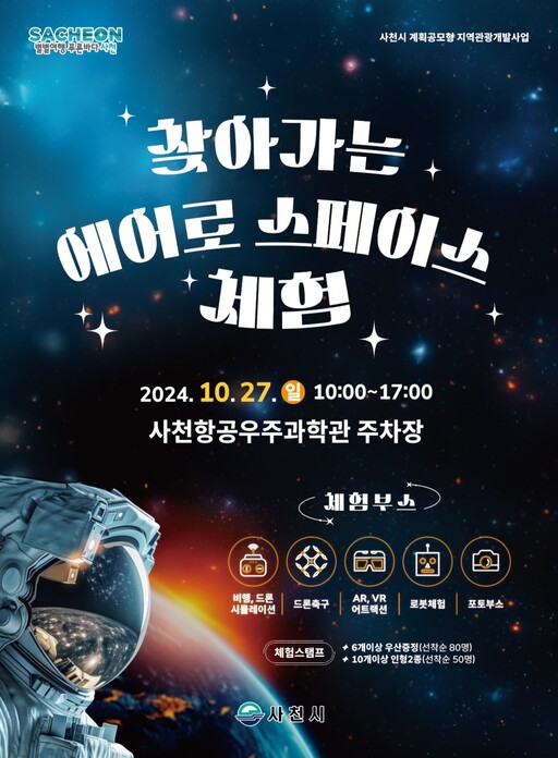 박동식 시장은 "우주항공수도 사천에서 찾아가는 에어로스페이스 체험 행사를 다시 한번 개최할 수 있어 기쁘다"며 "앞으로도 항공과 우주를 주제로 한 다양한 항공관광 콘텐츠를 마련하겠다"고 말했다.