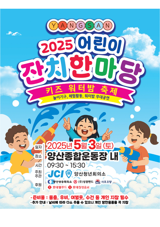 양산청년회의소의 주최·주관으로 열리는 이번 행사는 마칭밴드의 화려한 퍼레이드로 시작된다. 이어 DJ 깡구·포이와 함께하는 키즈 워터밤에서는 미니물대포 등을 활용해 어린이들이 물놀이를 즐기며 신나는 시간을 보낼 수 있다. 또 댄스팀, 어린이합창단, 키즈케이팝 등 다양한 공연도 마련돼 있다.