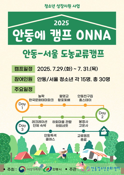 여성가족부와 안동시가 주최하고 안동청소년문화센터가 주관하는 청소년 교류 프로그램 '안동에 캠프 ONNA(온나)!'가 오는 7월 29일부터 31일까지 2박 3일간 안동시 일대에서 열린다.