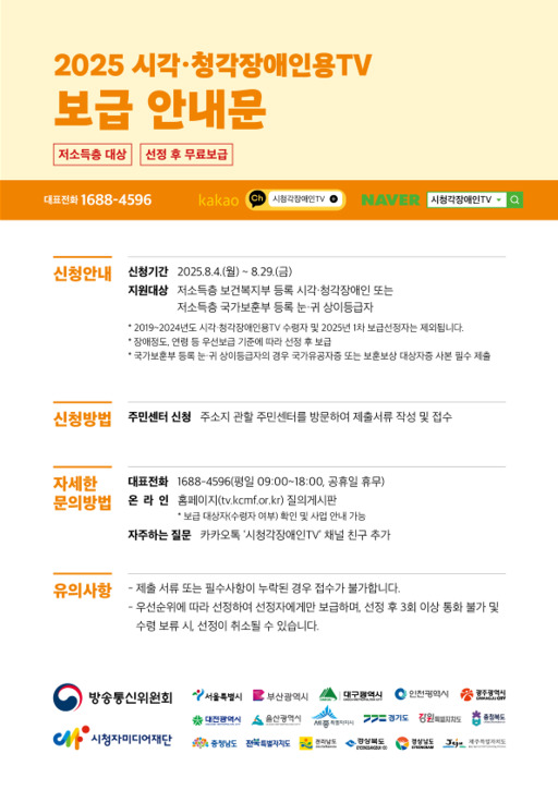 당초 1차 접수에서 수량이 남은 전국 약 6,500대가 이번에 추가 보급되며, 울진군도 참여 대상을 모집한다. 신청 대상은 시각 또는 청각장애인, 국가보훈부에 등록된 눈·귀 상이등급자 중 기초생활수급자나 차상위계층 등 저소득층이다. 단, 2019년부터 2024년까지 해당 TV를 이미 지원받은 경우는 신청에서 제외된다.
