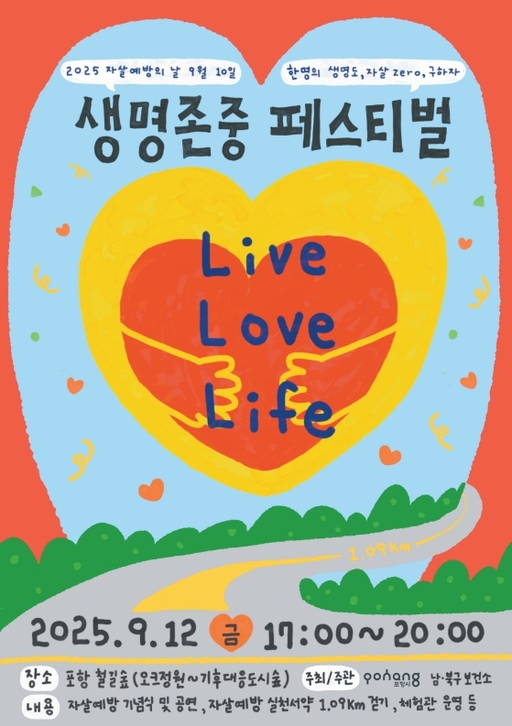 포항시 남·북구보건소는 오는 12일 오후 5시 포항철길숲(오크정원~기후대응도시숲)에서 자살예방의 날을 기념해 생명존중 페스티벌 'Live, Love, Life'를 개최한다. 이번 행사는 자살예방과 생명존중 문화 확산을 위한 다양한 프로그램으로 시민들과 함께한다.
