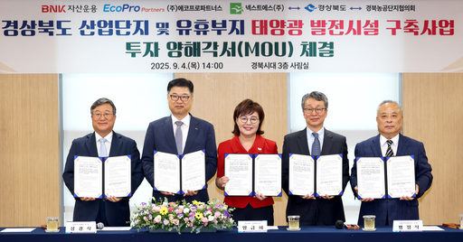 경북도는 4일 도청에서 BNK자산운용㈜, ㈜에코프로파트너스, 넥스트에스㈜, 경북농공단지협의회와 '산업단지 및 유휴부지 태양광 발전시설 구축사업' 공동협력 및 투자 양해각서(MOU)를 체결했다.