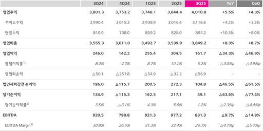 LG유플러스는 2025년 3분기 연결 기준 영업수익 4조108억 원, 서비스수익 3조1166억 원, 영업이익 1617억 원을 각각 기록했다고 5일 밝혔다.
