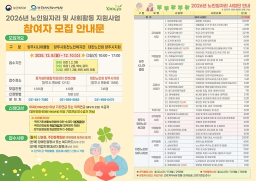 양주시가 오는 12월 8일(월)부터 10일(수)까지 3일간 '2026년 노인일자리 및 사회활동 지원사업' 참여자 2,710명을 모집한다.