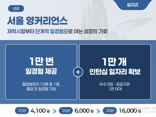 서울시가 청년 정책을 '사후 지원형'에서 '선제 투자·성장 중심'으로 전면 전환하며, 재학생 단계부터 일 경험을 제공하는 새로운 경력 지원 체계를 구축한다. 시는 2026년부터 2030년까지 총 1만6000명의 청년에게 단계적 실무 경험을 지원하고, 내년에는 6000명 규모 인턴십 기회를 우선 마련해 청년 사회진입 기간을 단축한다는 목표다.
