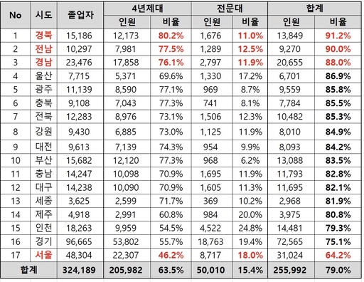 4년제대 진학 비율은 △경북 80.2% △전남 77.5% △충북 77.3% 순으로 높았다. 반면 △서울 46.2% △인천 54.5% △경기 55.7% 순으로 수도권이 최하위권을 형성했다.