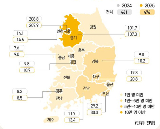 2024년 말 기준으로 추정된 올해 한국 부자 중 절반 정도(43.7%)인 20만7000명이 '서울특별시'에 살고 있었다. '경기도'(22.5%)와 '인천광역시'(3.1%)에 각각 10만7000명, 1만5000명이 거주해 수도권에 33만명(69.2%)이 집중됐다