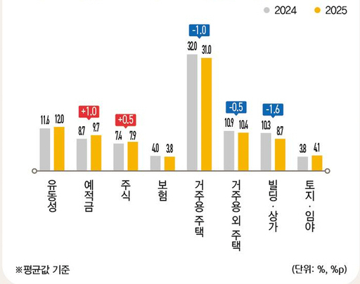 부동산 자산의 비중은 2011년 58.1%에 이어 2012년 59.5%로 높은 비중을 차지했지만 2025년 54.8%까지 낮아졌다. 투자 비중에 큰 변화가 없는 금융자산과 달리 기타자산의 경우 최근 금·보석 등 실물자산과 대체 투자처로 새롭게 부각되는 가상자산 등에 대한 투자가 늘면서 한국 부자의 포트폴리오에서 차지하는 비중이 높아졌다.