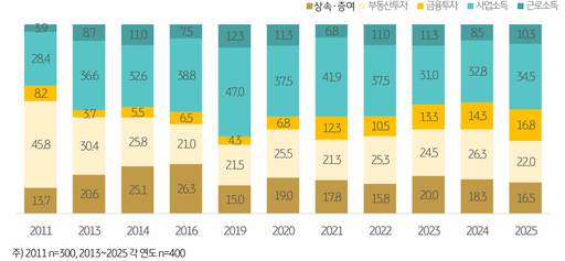 2011년 당시만 해도 '부동산투자'에 가장 관심이 많다는 응답자가 42.2%로 압도적으로 높았지만 2015년 18.5%, 2020년 21.8%, 2025년 14.8%로 크게 감소했다.