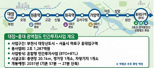 대장홍대선이 개통되면 현재 57분이 걸리던 부천 대장지구에서 서울 홍대의 거리가 27분으로 절반가량 단축될 예정이다. 화곡과 가양을 거쳐 상암과 홍대입구로 이어지기 때문에 부천은 물론 강서구, 고양 덕은지구까지 수도권 서부 지역 교통 인프라가 획기적으로 개선되고, 서울 도심 접근성 또한 높아진다.