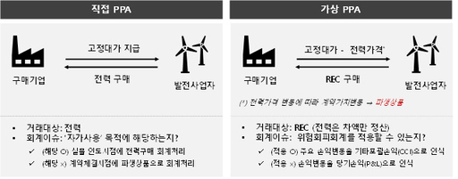 현재 자가사용 목적으로 발전사업자로부터 전력을 매입하는 계약(직접PPA)은 파생상품 회계처리를 면제해주고 있다. 다만 태양력, 풍력 등과 같이 자연에 의존하여 전력 매입량이 변동하는 특성을 가진 미사용 전력을 판매하는 경우 '자가사용' 목적에 해당하는지 불분명했다.