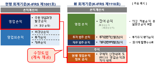 예컨대 지금은 영업손익을 주된 영업활동과 관련된 손익으로 한정하고 있지만 2027년부터는 전체 영업손익 중 투자 재무 등에 속하지 않는 잔여범주를 영업손익에 포함한다는 의미다.