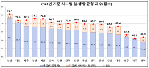 2024년 기준 전국 평균은 65.7점(가점 제외)으로 전년 대비 4.9점 상승했다. 17개 시·도 중 16개 지역에서 점수가 올라 전국적으로 일·생활 균형이 꾸준히 개선되는 흐름을 보였다.