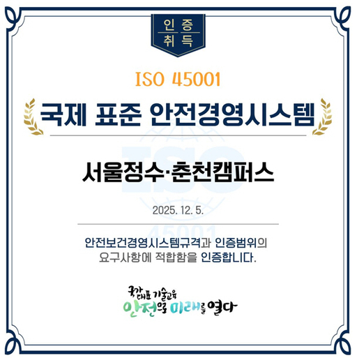 폴리텍대학은 29일 서울정수캠퍼스와 춘천캠퍼스가 국제표준 안전보건경영시스템인 ISO 45001 인증을 획득했다고 밝혔다.