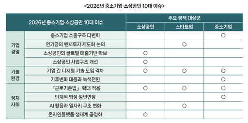 단계적 법정 정년연장, 온라인플랫폼 생태계 공정화, 연기금의 벤처투자 제도화 논의 등이 '2026년 중소기업·소상공인 10대 이슈'에 올랐다.
