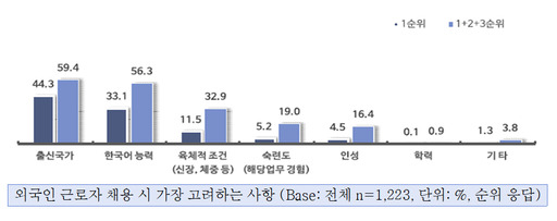 조사에 따르면 채용시 고려사항 '우선 순위'로는 ▲출신 국가(59.4%) ▲한국어 능력(56.3%) ▲육체적 조건(32.9%)을 주로 꼽았다. 출신 국가 뿐만 아니라 한국어 소통 능력이 중요한 모습이다.