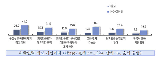 현 '고용허가제 개선 과제'로는 ▲불성실 외국인력 제재 장치 마련(41%) ▲외국인 근로자 체류 기간 연장(31.5%) ▲외국인 근로자 생산성을 감안한 임금 적용 체계 마련(25.6%) 등의 순으로 많았다.