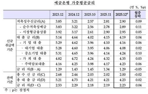 27일 한국은행이 발표한 '2025년 12월 금융기관 가중평균금리'에 따르면 예금은행의 신규취급액 기준 저축성수신금리는 연 2.90%로 전월(2.81%) 대비 0.09%p 상승했다. 대출금리도 연 4.19%로 전월(4.15%)보다 0.04%p 올랐다.