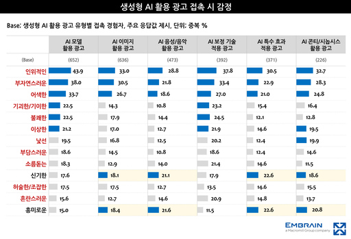 19일 시장조사 전문기업 엠브레인 트렌드모니터가 전국 만 13~69세 남녀 1200명을 대상으로 '생성형 AI 활용 광고 접촉 경험 및 인식'을 조사한 결과, 생성형 AI 광고가 빠르게 일상화되는 동시에 소비자 반감도 함께 커지고 있는 것으로 나타났다. 이에 따라 AI 광고에 대한 가이드라인 필요성 역시 높아지고 있는 분위기다.