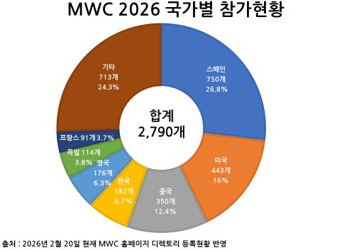 2026년 MWC 참가 기업 수는 총 2790개로, 이 가운데 일반 기업 1829개, 스타트업 961개다. 국가별로는 스페인 750개, 미국 443개, 중국 350개, 한국 182개, 영국 148개, 독일 114개, 프랑스 91개 순이다. 4YFN 참가 비중은 스페인, 한국, 미국 순으로 나타났다. 중국은 전년도 대비 참가 기업 수가 늘었으며, 일부 전시홀을 대규모로 활용한다.
