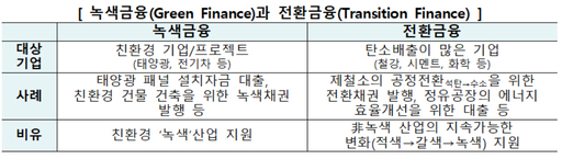 고탄소 업종의 저탄소 전환을 지원하는 '한국형 전환금융'도 도입한다. 재생에너지 등 친환경 활동 중심의 녹색금융과 달리, 철강·화학·시멘트 등 탄소 다배출 산업의 설비 효율화, 연료 전환 등 탄소감축 활동까지 지원 범위에 포함하는 개념이다. 금융당국이 제시한 전환금융 가이드라인은 EU 개념체계를 벤치마킹한 녹색 분류체계(K-Taxonomy) 기반 전환금융과, 일본과 유사한 업종별 탄소감축 이행 로드맵 기반 전환금융을 포괄하도록 설계됐다.