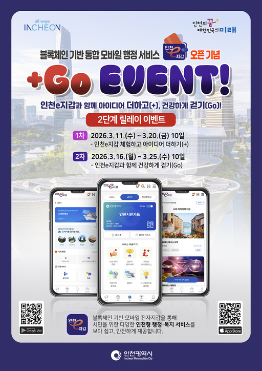 2차 이벤트 '인천e지갑과 함께 건강하게 걷기(Go)'는 3월 16일부터 25일까지 진행되며, 앱의 '챌린지' 메뉴를 통해 참여할 수 있다. 자세한 일정과 참여 방법은 인천e지갑 앱과 인천시 누리집에서 확인할 수 있다.