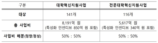사업비는 대학혁신지원사업 8191억원, 전문대학혁신지원사업 5617억원으로 총 1조3808억원 규모다. 여기에 올해 특성화 인센티브가 신설, 포함됐다. 특성화 인센티브는 일반대학 850억원, 전문대학 340억원 규모로 편성됐다.