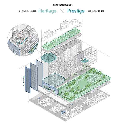 넥스트 리모델링은 기존 지하와 지상 구조체를 그대로 두고, 세대와 공용부 내·외부 마감 변경과 함께 설비 등 시설을 고도화해 신축아파트 이상의 성능과 가치를 확보하도록 하는 방식이다. 여기에 삼성물산의 주거 플랫폼 '홈닉(Homeniq)'을 비롯한 스마트 홈 환경과 넥스트홈(Next Home) 기술도 적용된다.