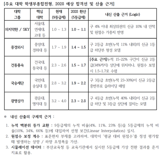 이러한 통계적 지표의 변화를 반영해 기존 9등급제 합격선을 5등급제 체제로 정밀하게 매칭한 인서울 대학 라인별 예상 합격 가이드는 다음과 같다.