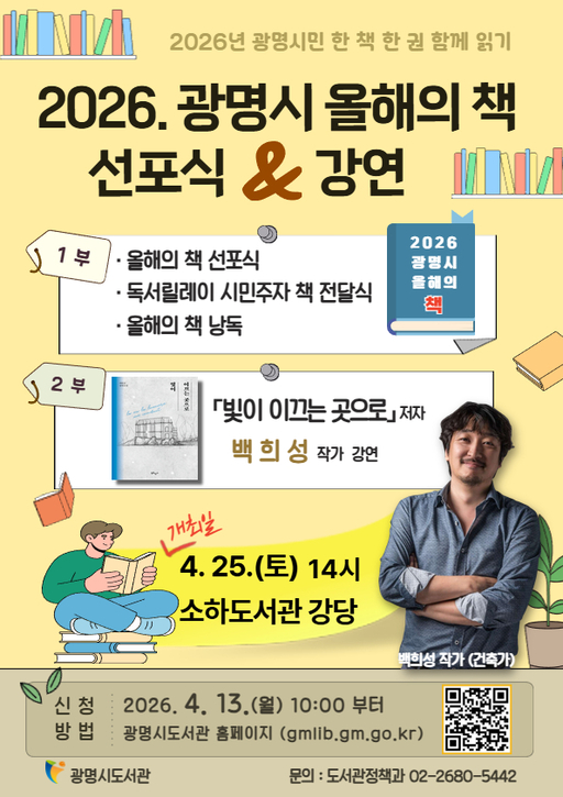 광명시는 전 세대를 아우르는 독서문화 확산을 위해 오는 25일 오후 2시 소하도서관 강당에서 '2026년 광명시민 책 한 권 함께 읽기' 올해의 책 선포식을 개최한다.